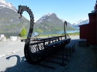 In der Hoffnung, die Schautafeln doch noch zu finden, machten wir uns auf die Suche nach dem Schrottplatz – ohne eine Vorstellung davon zu haben, wie ein solcher in Norwegen aussieht. Tatsächlich sahen wir von der Straße aus, das Wikingerschiff aus Metall rechter Hand auf einem Hügel stehen. Verunsichert fuhren wir den Schotterweg hinauf, der an einem Haus vorbei zu dem kahlen Platz führte, der umsäumt von niedrigem Gestrüpp mitten in grünen Wiesen lag. Der trostlose Anblick des Schiffes, das bestimmt schon Sitzgelegenheit für zünftige Feiern geboten hatte, stimmte mich traurig und hätte das Metallgestell ins Auto gepasst, wir hätten es glatt mitgenommen. Das Schiff sowie die Infotafel des Frauengrabes, die ich wiedererkannte, bildeten den armseligen Rest der wertvollen Informationen und wir gaben die Suche auf.